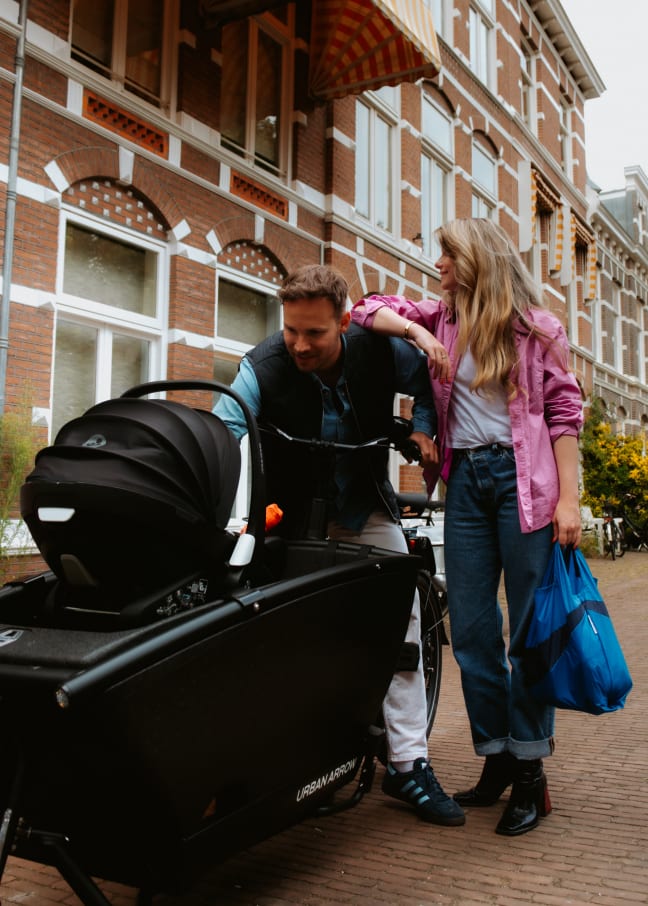 We are Daisy May Breuer (31), Emile (34), and Soe Huisman (8 months), living in The Hague. Daisy works as a freelance brand creative for events, marketing campaigns, and shoots, and Emile works as Head of Sales. We have been a proud Urban Arrow family since early 2024, when our daughter Soe was born.